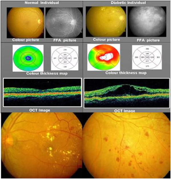 Diabetic retinopathy diagnosis and management – Screening for diabetic retinopathy is important for individuals having diabetes of five years or more duration. It can destroy the vision silently over a period of time. Patients if diagnosed would need FFA and/or OCT to define the stage of the disease.